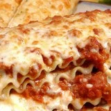 - This hearty portion with our fine meaty tomato sauce, ricotta, mozzarella, fresh-baked and sprinkled with parmesan